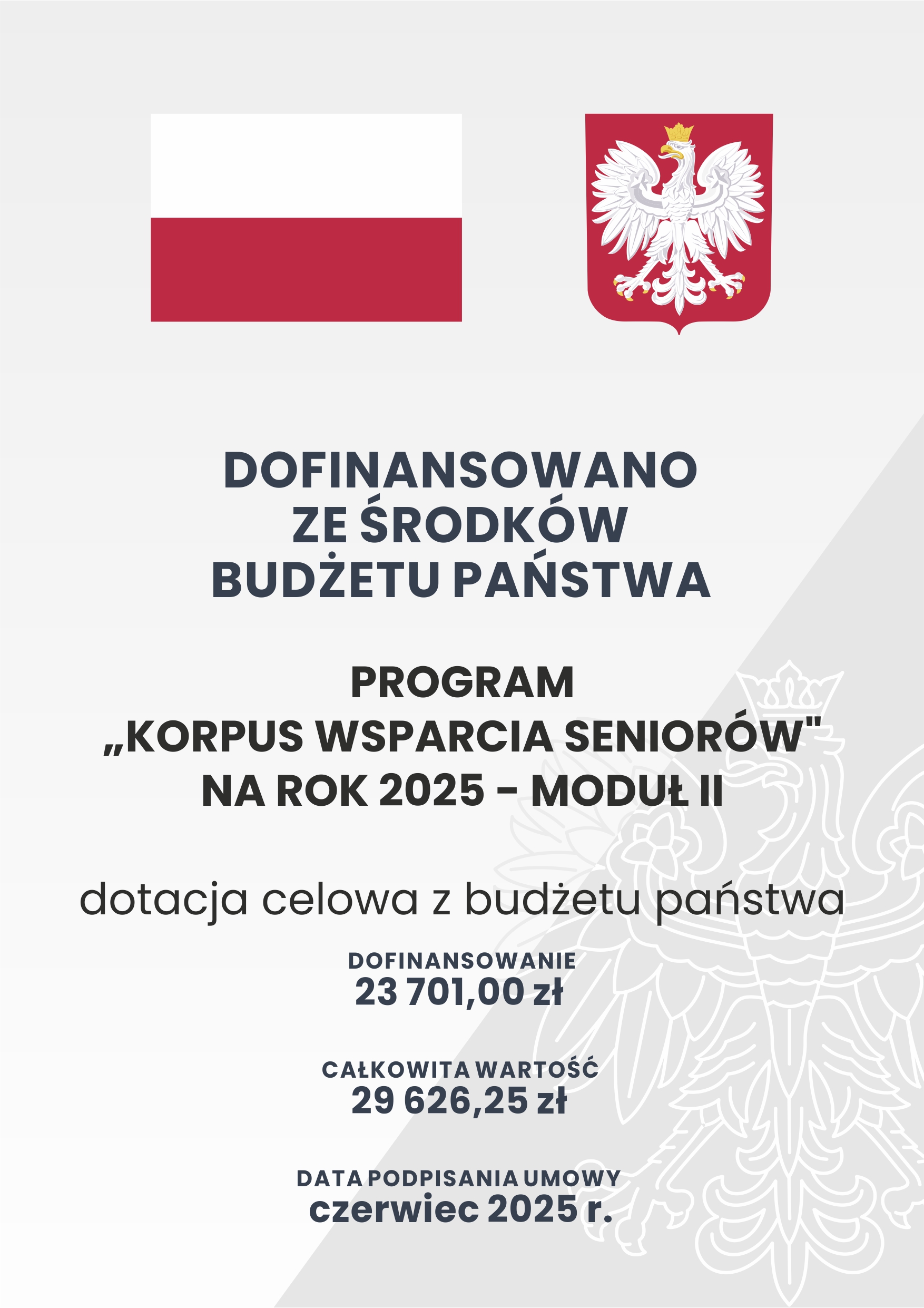 Program Korpus Wsparcia Seniora finansowany jest z dotacji celowej budżetu Państwa na dofinansowanie zadania w postaci usługi wsparcia na rzecz seniorów w roku 2025.